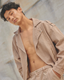 Boxy biker-style jacket made from 100% cotton denim. It features an irregular acid wash that makes each piece unique. Care instructions are printed inside the garment. The model is 1.85 m tall and is wearing a size L.